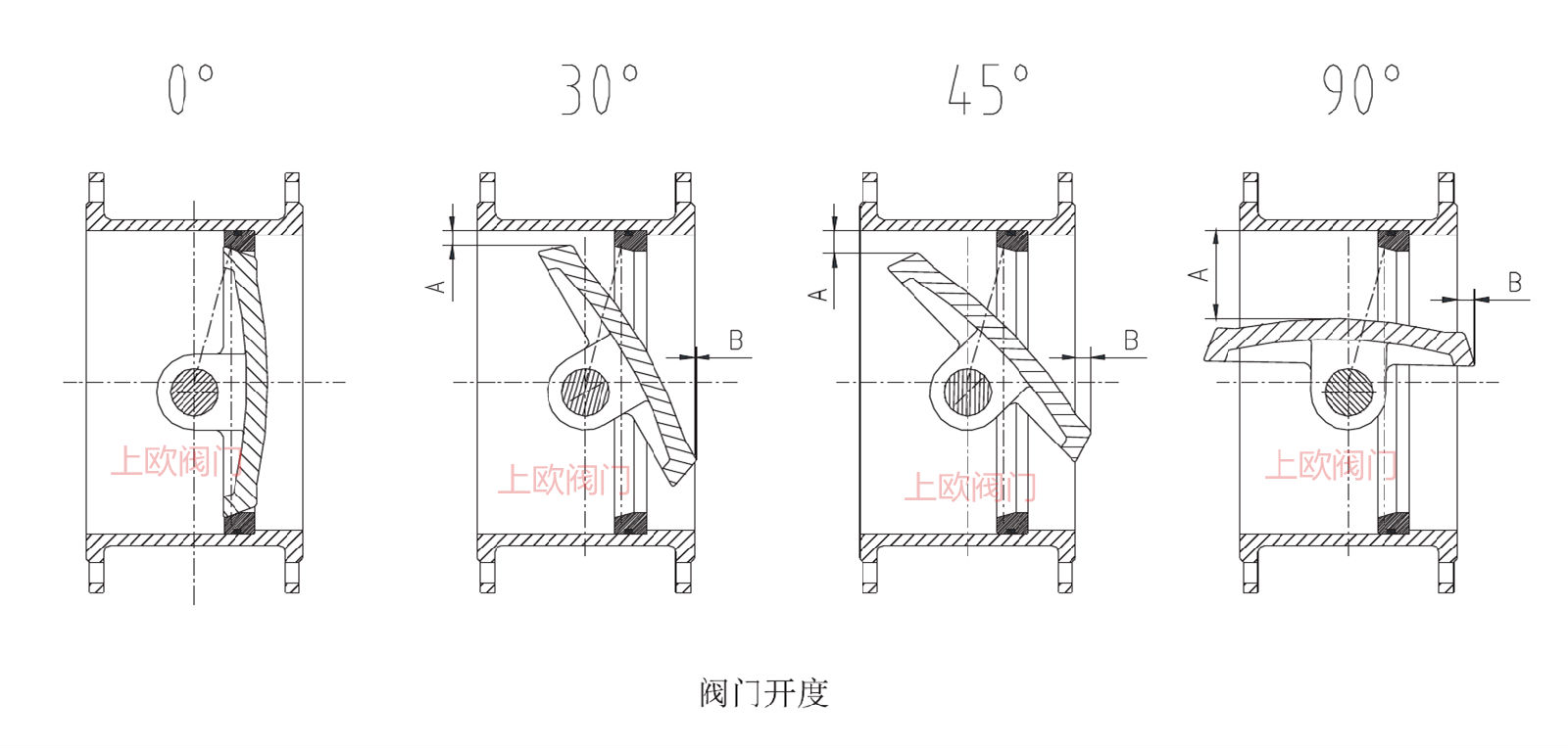 因為轉動中心偏離閥芯幾何中心,就有閥芯打開時閥芯實體不斷向后退、向內縮、閥芯關閉時閥芯實體不斷向前進、向外脹的實際效果,其功能相當于半球閥、閘閥、截止閥、蝶閥的綜合。打開各不同角度變化圖:
