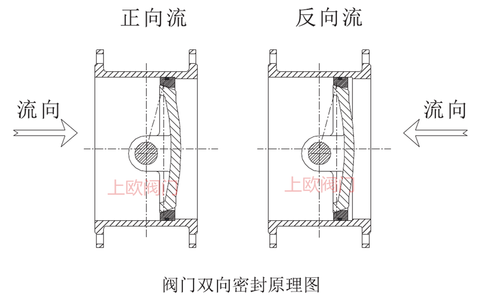 雙向流閥門的最主要功能是既能在正向壓力時密封良好,又能在反向壓力或反向壓力大于正向壓力時也能密封良好。當正向壓力作用時,介質壓力推動閥板向前移動,閥桿彈性變形,閥板密封面緊貼閥座密封面傳遞壓力,將閥座推向閥體臺階,使之密封良好。當反向壓力作用時,介質壓力推動閥板向后移動,閥桿彈性變形,介質壓力同時推動閥座向后移動,使閥座密封面緊貼閥板密封面并保持密封比壓,使之密封良好。
