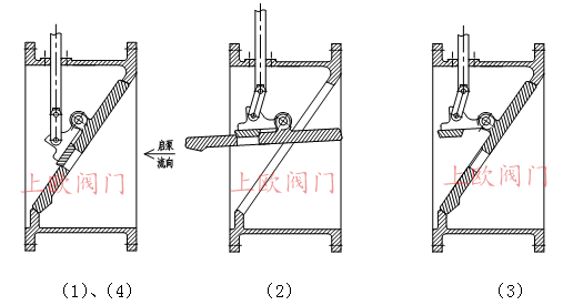 2、關閥:停泵瞬間,閥門進口流量及壓力突然降低,大閥板在重力作用下迅速關閉(閥板與閥座接觸前,設有緩沖機構,保護密封面),截斷大部分水流,小閥板在控制腔作用下自動開啟泄除回流壓力水,削減水錘峰值,如圖(3)示;同時,一部分回流水通過旁通管道進入控制腔上腔,推動控制桿下行,關閉小閥板至完全切斷介質,如圖(4):示。關閥時間可通過旁通管道上的調節閥調節,使水錘峰值在控制范圍內。