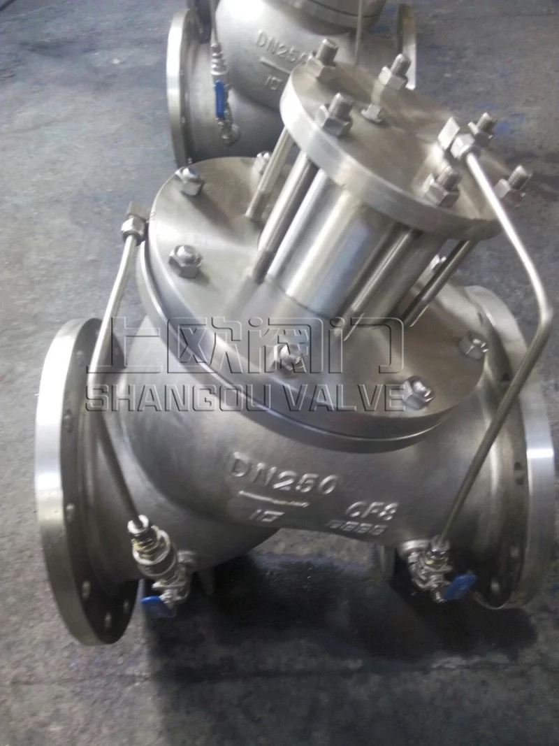 不銹鋼水泵控制閥由主閥和調節閥及接管系統組成,閥體采用直流式閥體,主閥控制室為膜片式或活塞式的雙控制室結構,控制室比一般水力控制閥增加了一個,增加了對主閥的控制功能,實現了對水泵出口的緩慢開啟、全開、緩閉、截止等多功能控制,實現了一個閥門、一次調節對水泵出口的多功能控制。JD745X多功能水泵控制閥的接管系統采用調節閥控制,通過設定調節閥的開度,可方便實現需要的各項控制參數,如主閥的開啟速度、緩閉速度等等。